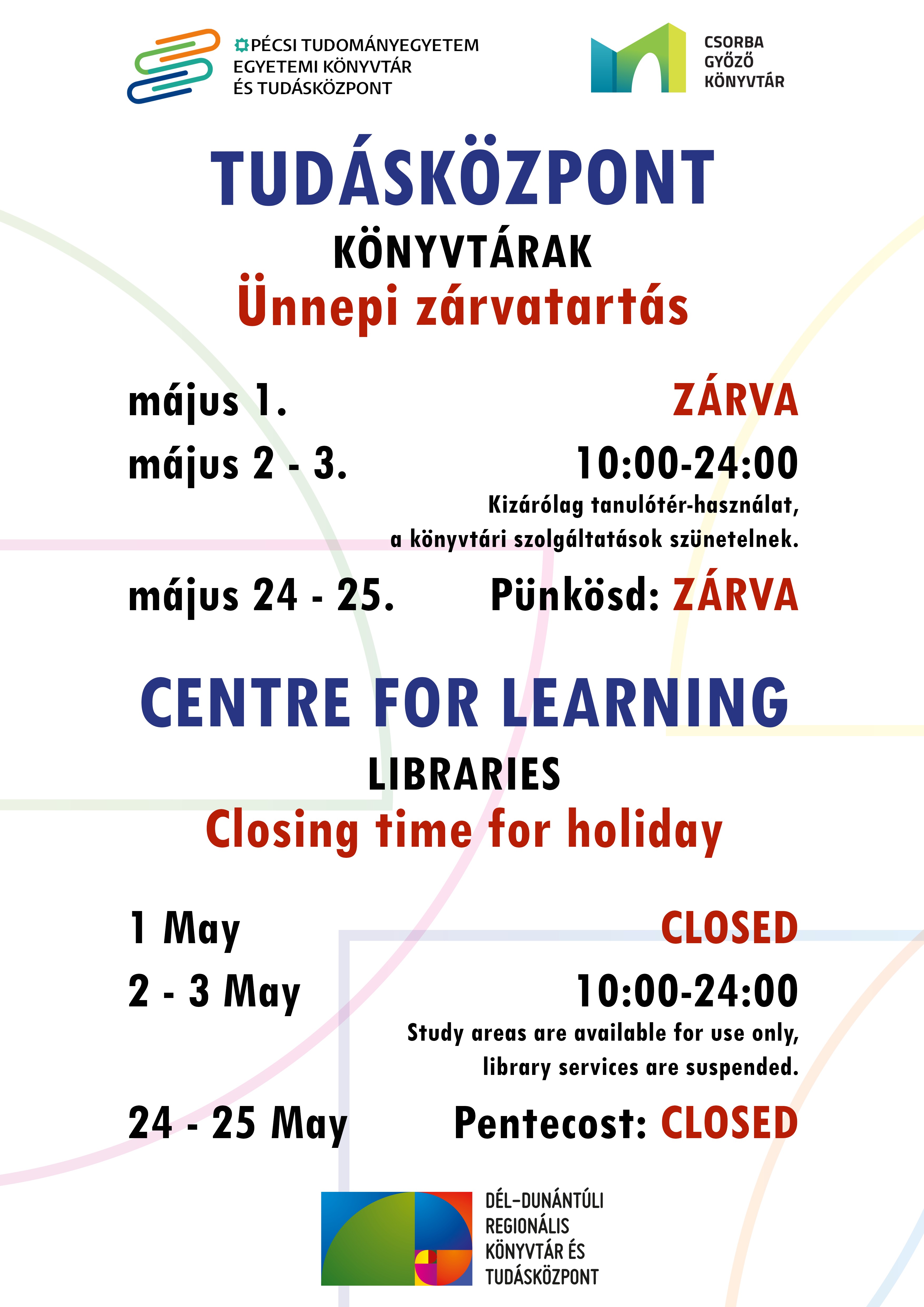 Május 2–3: 10:00 – 24:00 – kizárólag tanulótér-használat elérhető, a könyvtári szolgáltatások szünetelnek.
