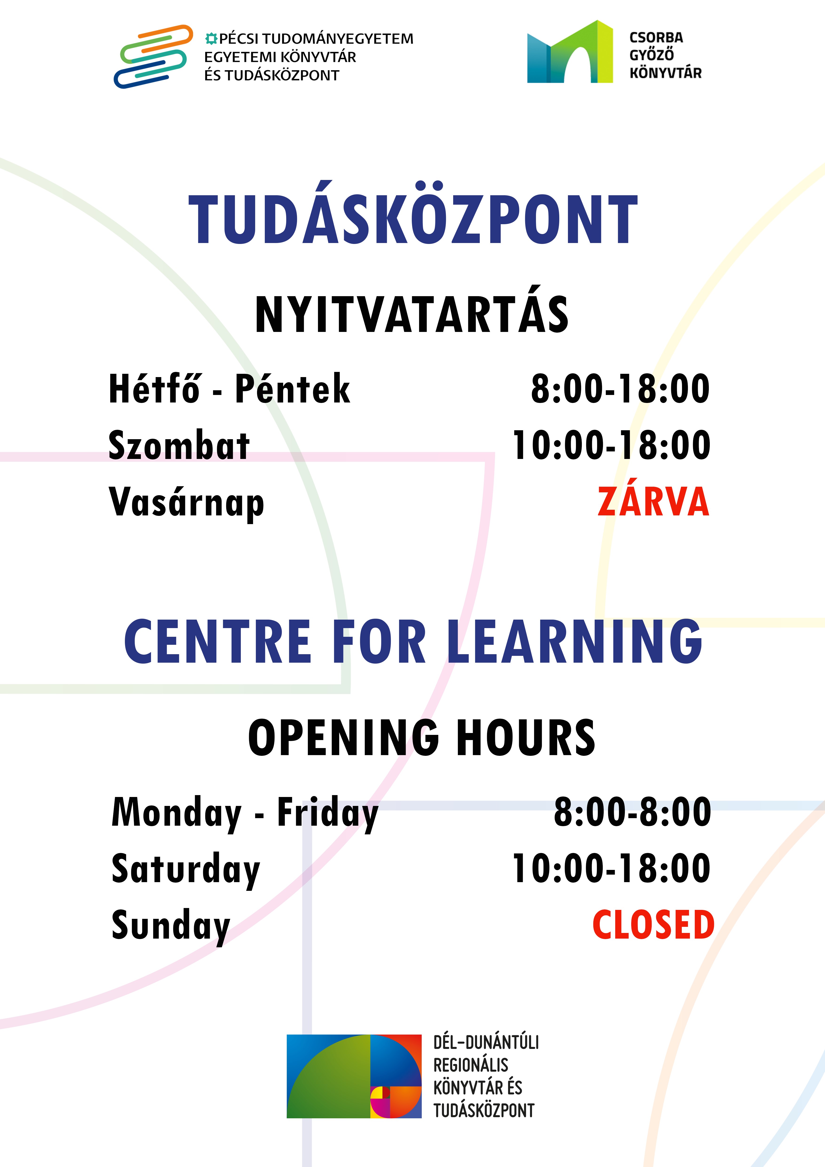 Nyitvatartás a Tudásközpontban/ Opening hours in the Knowledge center