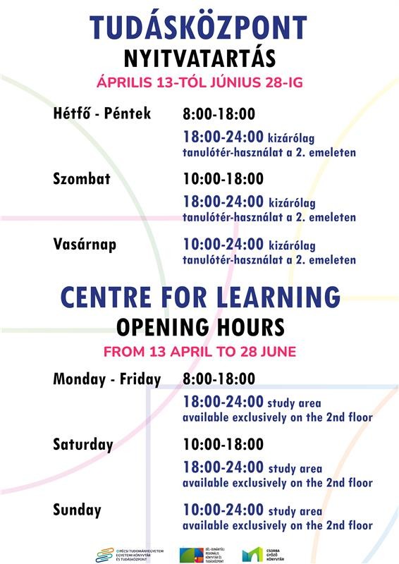 Tájékoztatjuk kedves olvasóinkat, hogy a könyvtári egységek nyitvatartása a Tudásközpont épületében 2026. április 13. – június 28. között megváltozik: